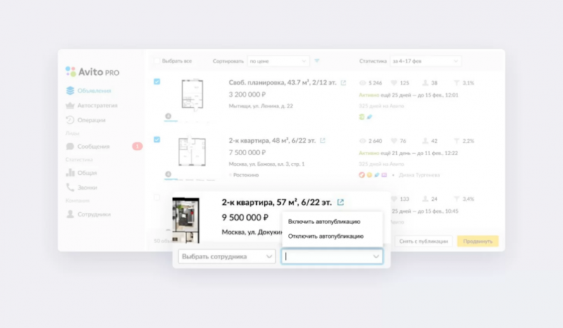 - Раздел «Сотрудники». Делегирование команде работы с объявлениями и отслеживание их эффективности.