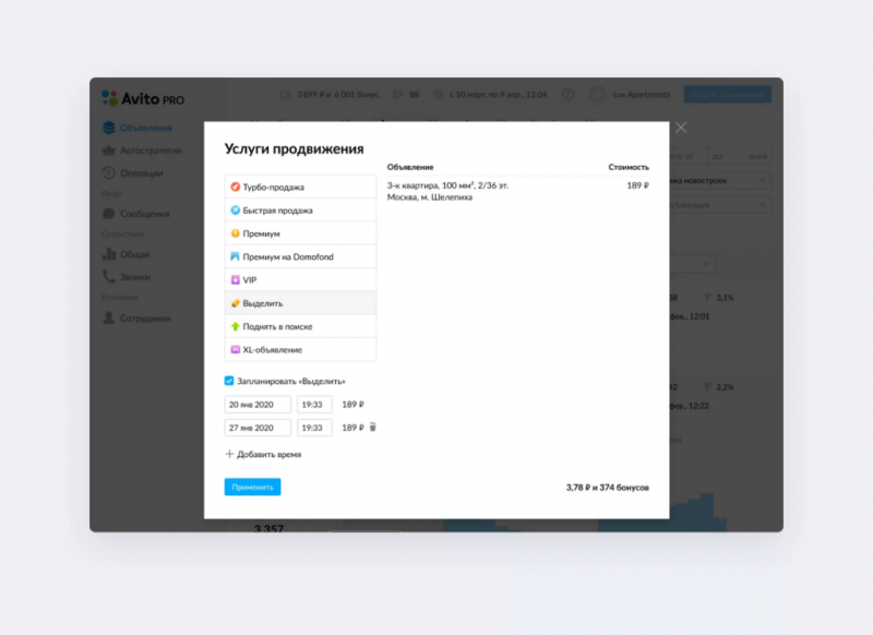 - Автостратегия. Автоматическое определение наиболее выгодного времени для продвижения. Доступна для категорий «Недвижимость/Вторичное жилье» и «Авто/Автомобили с пробегом».
