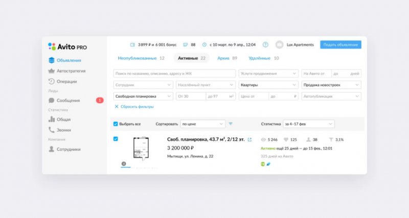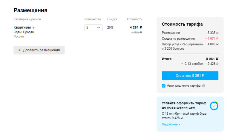 Например, вы выбрали тариф «Расширенный» и 5 размещений в категории «Недвижимость». Вы оплатили 8 261 рубль, где 4 000 рублей – это стоимость услуг в тарифе. Из нее 3 200 рублей вернутся в виде бонусов на кошелек Авито.
