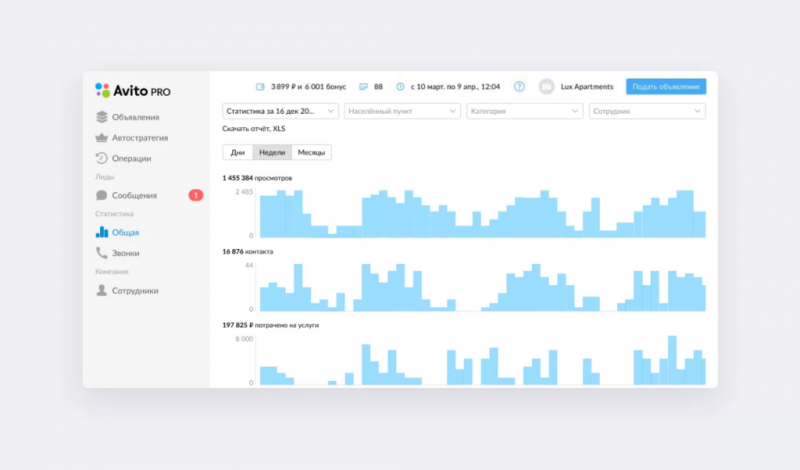 В этой вкладке можно посмотреть общую статистику в виде наглядного графика. Она может быть нужна, например, тогда, когда необходимо понять, почему обращений с Авито стало меньше или больше. Для этого нужно выбрать интересующий период, оценить количество активных объявлений и расходы на продвижение. Соответствующие фильтры помогут просмотреть статистику по объявлениям в отдельном населенном пункте или категории.