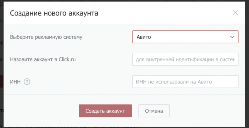 Введите название. Оно будет отображаться в личном кабинете Click.ru. Укажите ИНН, который раньше не использовался в Авито.Затем нажмите «Создать аккаунт». Вы увидите такое окно:
