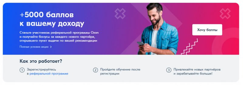 Кроме открытия ПВЗ можно зарабатывать на реферальной программе Озон и получать до 5 000 баллов за каждого партнера, открывшего пункт ПВЗ по вашей рекомендации. 1 балл = 1 рубль. Также можно участвовать в стандартной реферальной программе Озона, то есть зарабатывать с заказов клиентов, которые покупают товары на Озоне.
