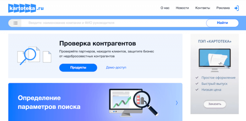 КАРТОТЕКА – это платный сервис для проверки контрагентов по ФИО руководителя и адресу компании. Подходит как крупным игрокам, банкам, юридическим и финансовым компаниям, так и ИП, начинающим предпринимателям. Отличный выбор для тех, кто сотрудничает с отечественными и зарубежными контрагентами.