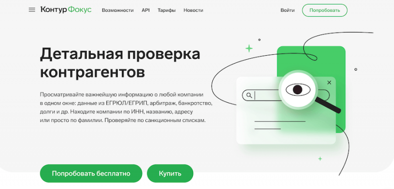 Контур.Фокус — это платный сервис для проверки контрагентов по ИНН или фамилии руководителя, названию организации или адресу регистрации. Подходит крупным компаниям, сотрудничающим с контрагентами по России, СНГ, Украине, Европе и Китаю.