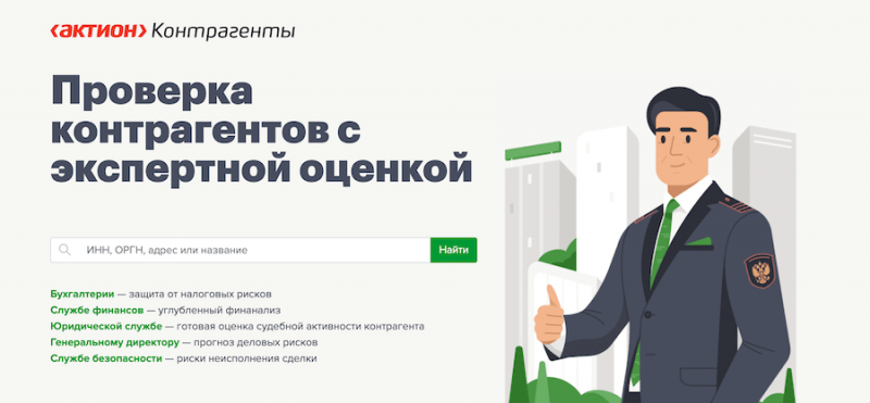 Актион Контрагенты – платная программа для проверки контрагентов по ИНН, ОГРН, КПП, ОКПО, названию, адресу, ФИО руководителя, телефону, адресу электронной почты, домену. Идеально подходит крупным игрокам с международными связями.
