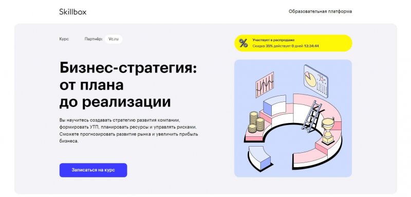 Курс «Бизнес-стратегия: от плана до реализации» разработан образовательной платформой Skillbox совместно с интернет-изданием VC.ru. Предусматривает обучение в удобное для студента время, включает в себя видеолекции и практические задания на основе реальных кейсов. Предназначен для предпринимателей и владельцев бизнеса, подойдет также для самозанятых, руководителей подразделений и топ-менеджеров.