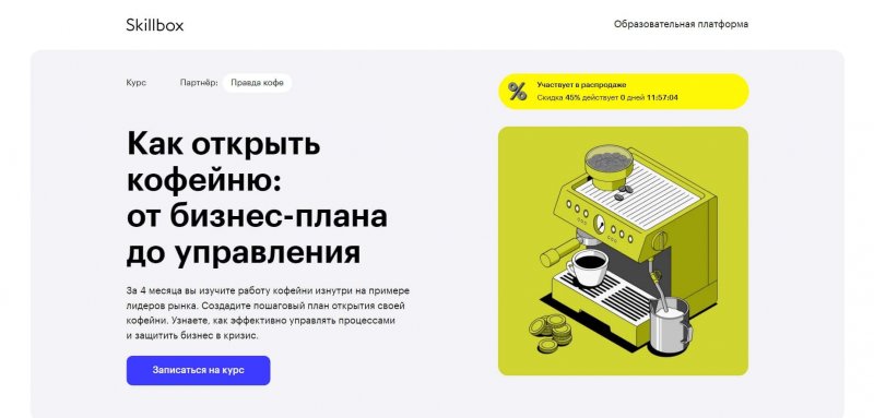 Курс «Как открыть кофейню: от бизнес-плана до управления» разработан экспертами Skillbox совместно с сетью кофеен «Правда кофе», содержит видеоматериалы и практические задания с разбором бизнес-кейсов. Предназначен для начинающих предпринимателей, бариста и бизнесменов, желающих открыть кофейню.