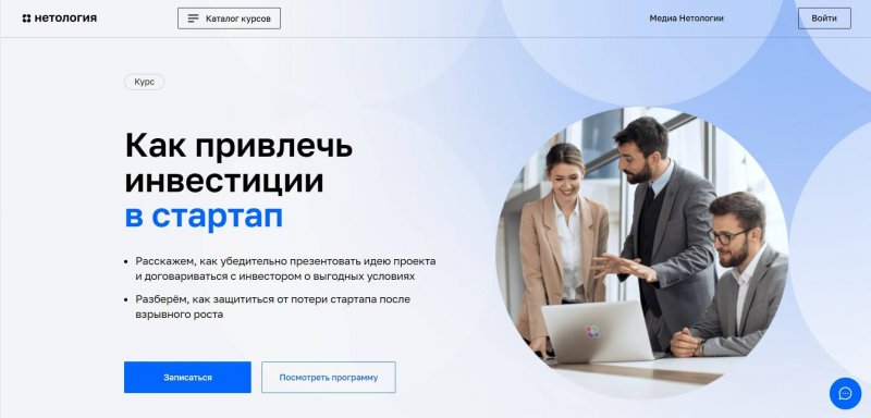 Курс «Как привлечь инвестиции в стартап» от Нетологии состоит из видеолекций и практических заданий, которые проверяет преподаватель. Предназначен для начинающих предпринимателей и действующих бизнесменов, испытывающих затруднения с привлечением инвестиций в свой бизнес.