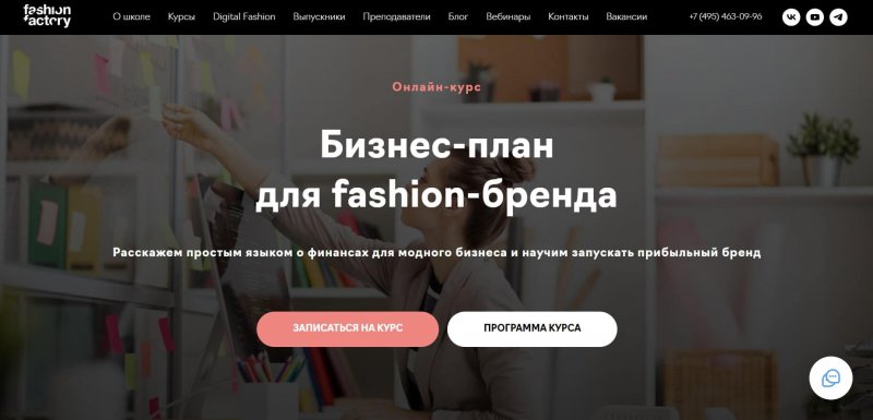 Курс «Бизнес-план для fashion-бренда» от Fashion Factory состоит из 9 модулей, включающих в себя видеоуроки, в которых опытные преподаватели дают подробные разъяснения всех бизнес-процессов, и практические работы, с детальным разбором каждой изученной формулы. В процессе обучения предусмотрено 2 онлайн-встречи с экспертами в формате вопросы-ответы. Курс предназначен для начинающих бизнесменов, желающих создать и раскрутить собственный бренд.