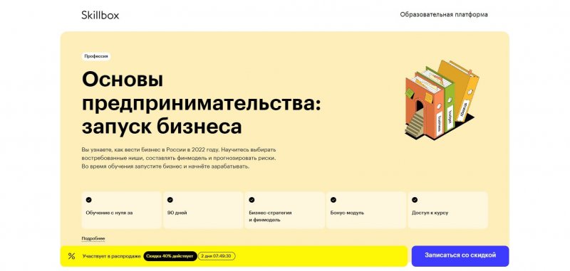 Курс «Основы предпринимательства: запуск бизнеса» от экспертов Skillbox содержит видеоматериалы и практические задания на основе реальных кейсов. Предназначен для начинающих предпринимателей, владельцев и руководителей бизнеса.