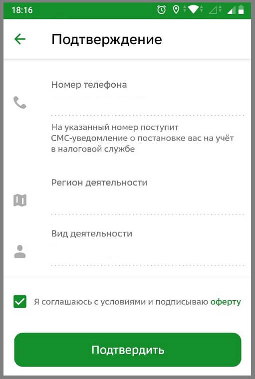 - Укажите номер телефона, регион ведения и вид деятельности. Ознакомьтесь с офертой и подтвердите согласие.