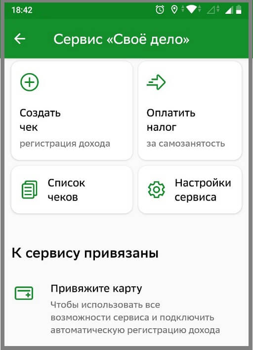 - После подтверждения подключится сервис «Свое дело». Здесь можно оформлять чеки и оплачивать налоги. Если привязать к сервису карту, чеки будут автоматически формироваться на все суммы, которые поступают от физлиц.